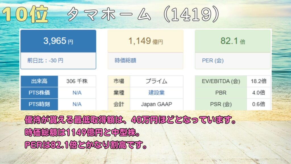 優待が貰える最低取得額は、10万円ほどで、買いやすい水準です。