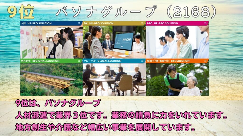 人材派遣で業界3位です。業務の請負に力をいれています。地方創生や介護など幅広い事業を展開しています。