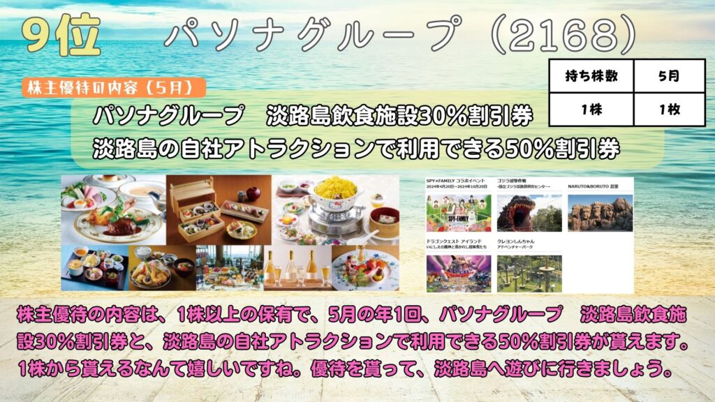 株主優待の内容は、1株以上の保有で、5月の年1回、パソナグループ 淡路島飲食施設30%割引券と、淡路島の自社アトラクションで利用できる50%割引券が貰えます。