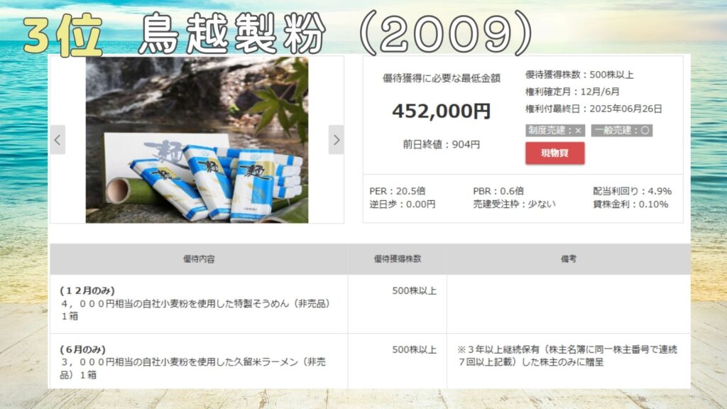 株主優待の内容は、100株以上で6月12月のねん2回、自社小麦粉を使用したそうめんと久留米ラーメンが貰えるよ。