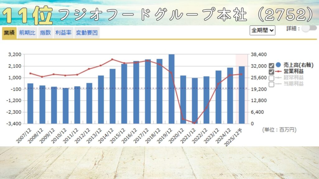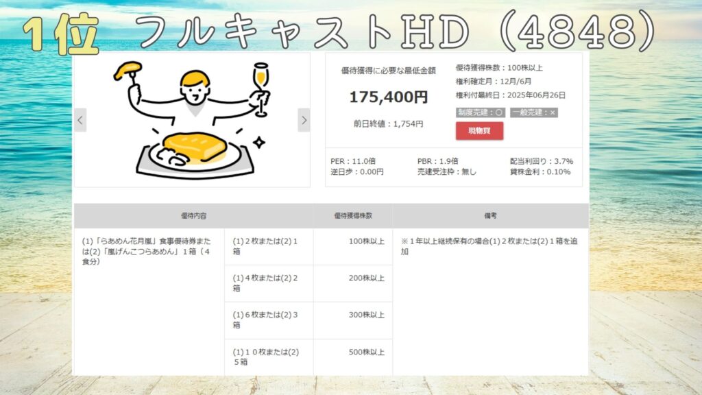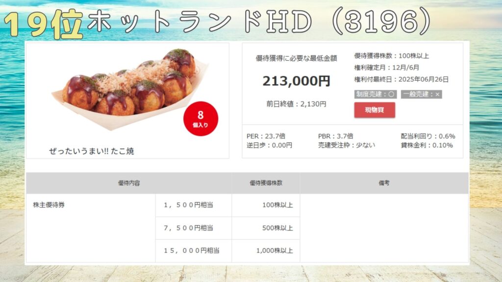株主優待の内容は、100株以上で6月12月のねん2回、らあめん花月嵐の食事券が貰えるよ。