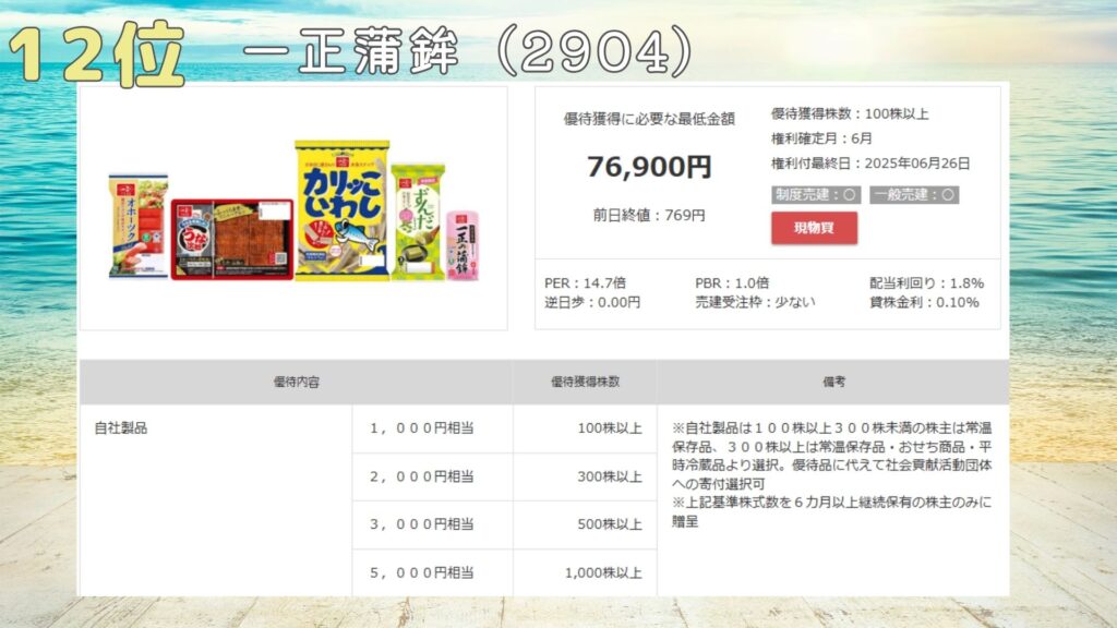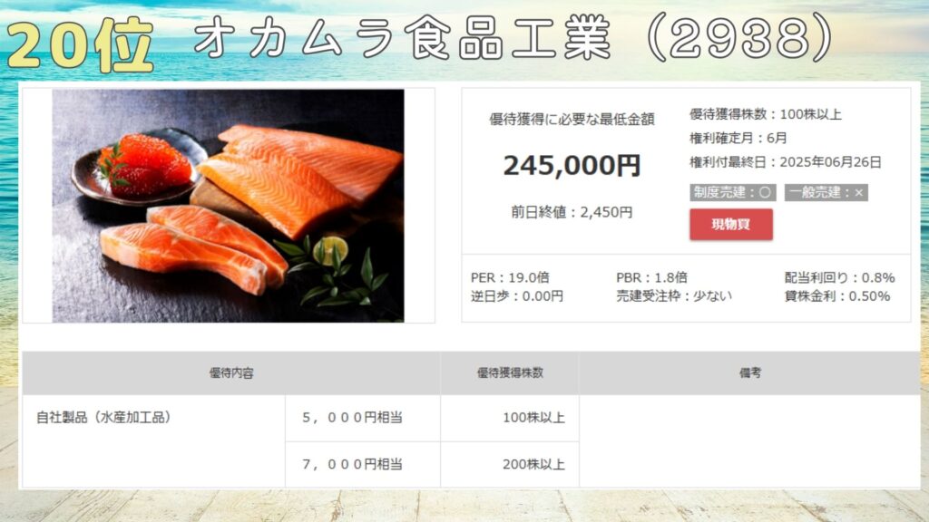 株主優待の内容は、100株以上で5000円相当の自社製品、水産加工品が貰えるよ。