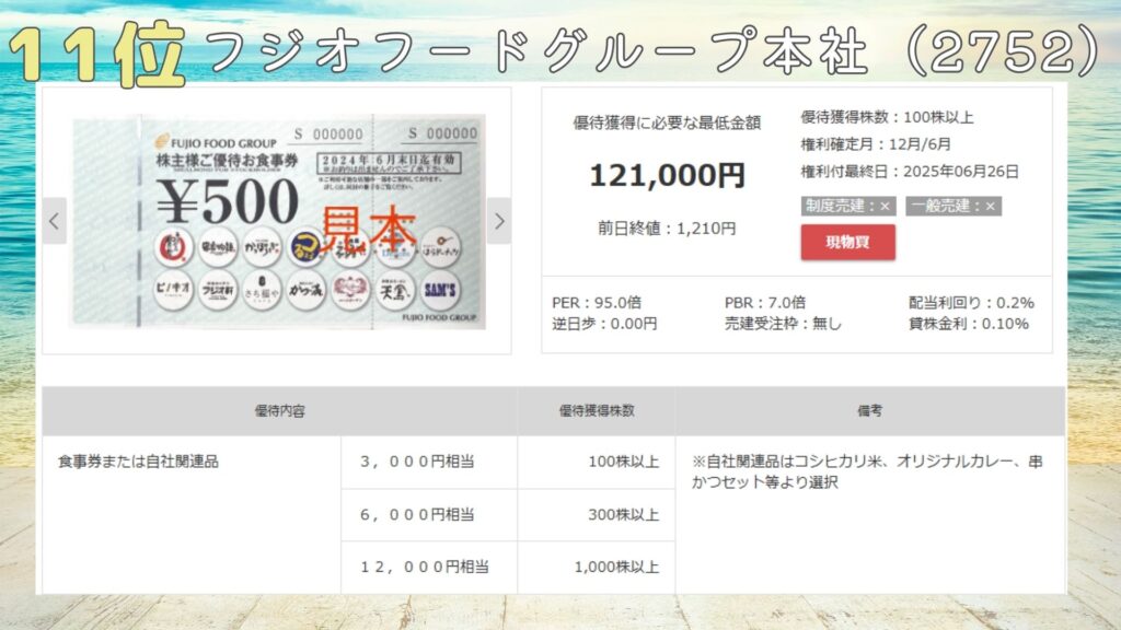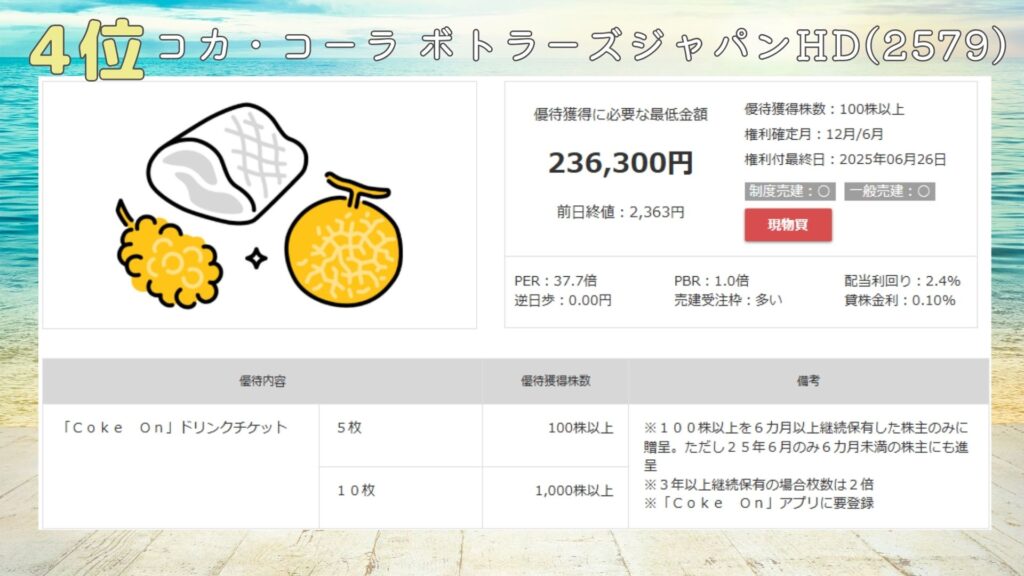 株主優待の内容は、100株以上で6月12月のねん2回、コークオンのドリンクチケットが5枚貰えるよ。