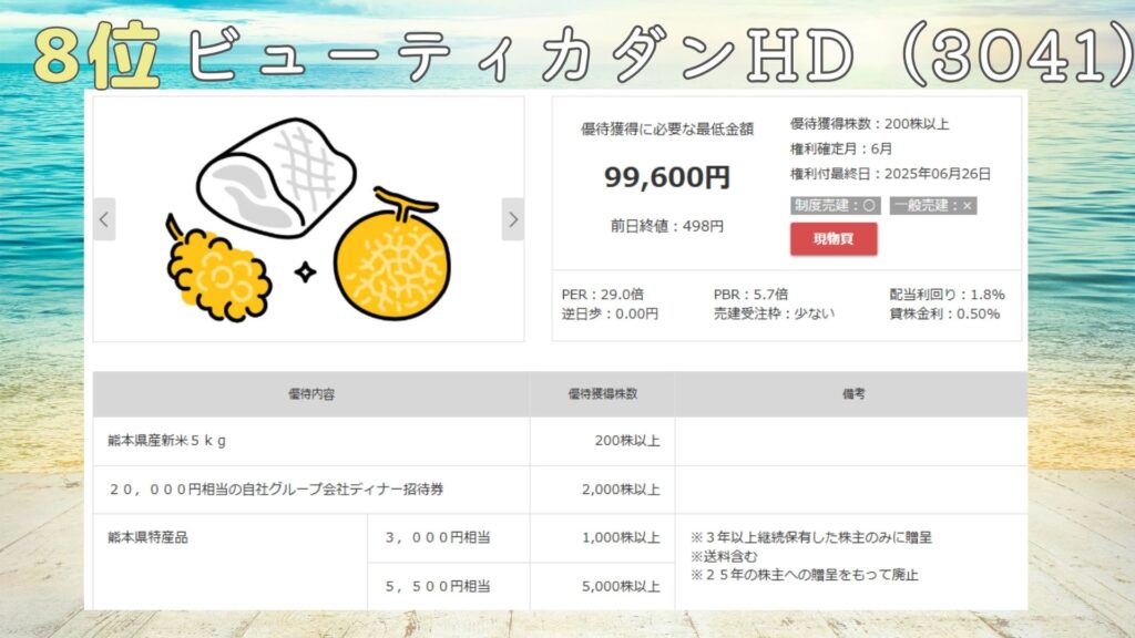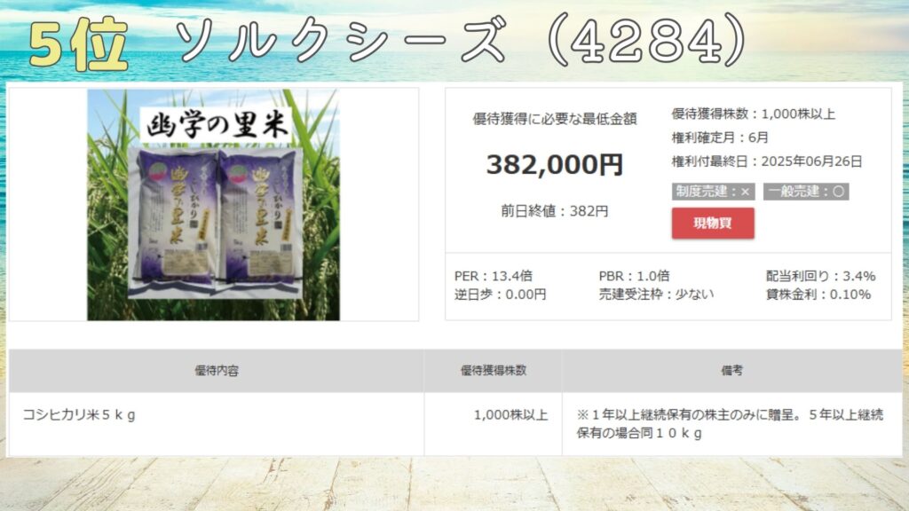 株主優待の内容は、100株以上で新潟産のお米が5キロ、貰えるよ。