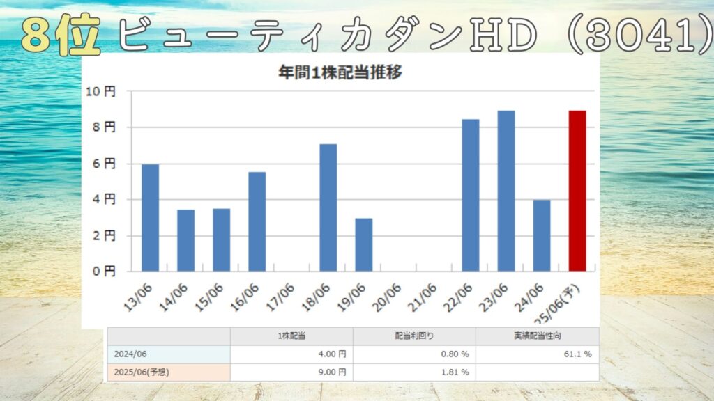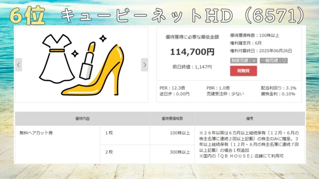 株主優待の内容は、100株以上で6月のねん1回、無料ヘアカット券が貰えるよ。