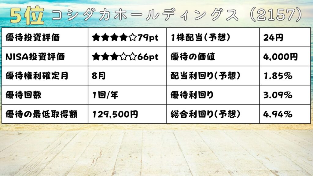 優待投資評価は80ポイントで、星5つだよ。