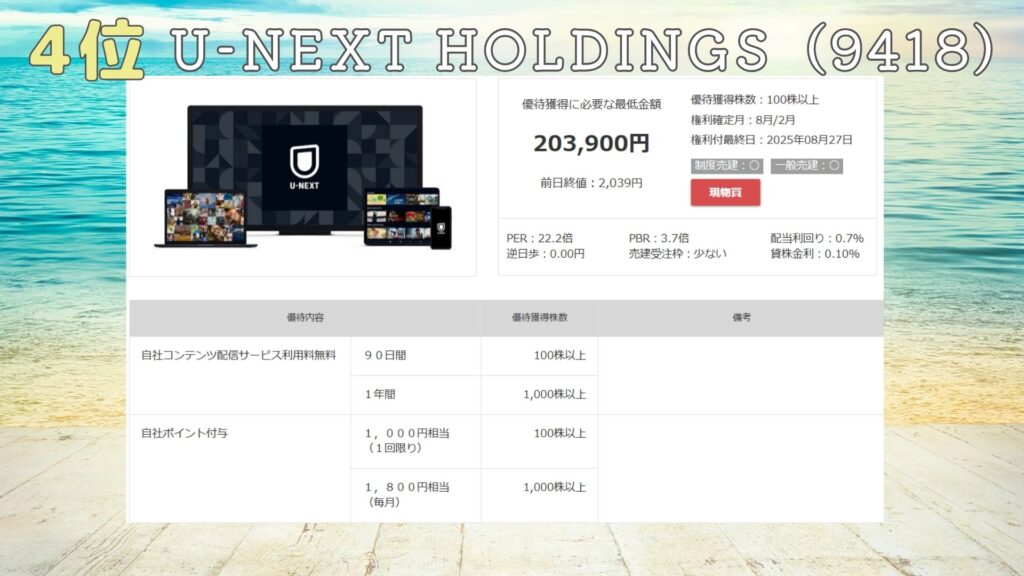 株主優待の内容は8月2月のねん2回、自社コンテンツ配信サービスU-NEXTの無料サービスやポイントが貰えるよ。