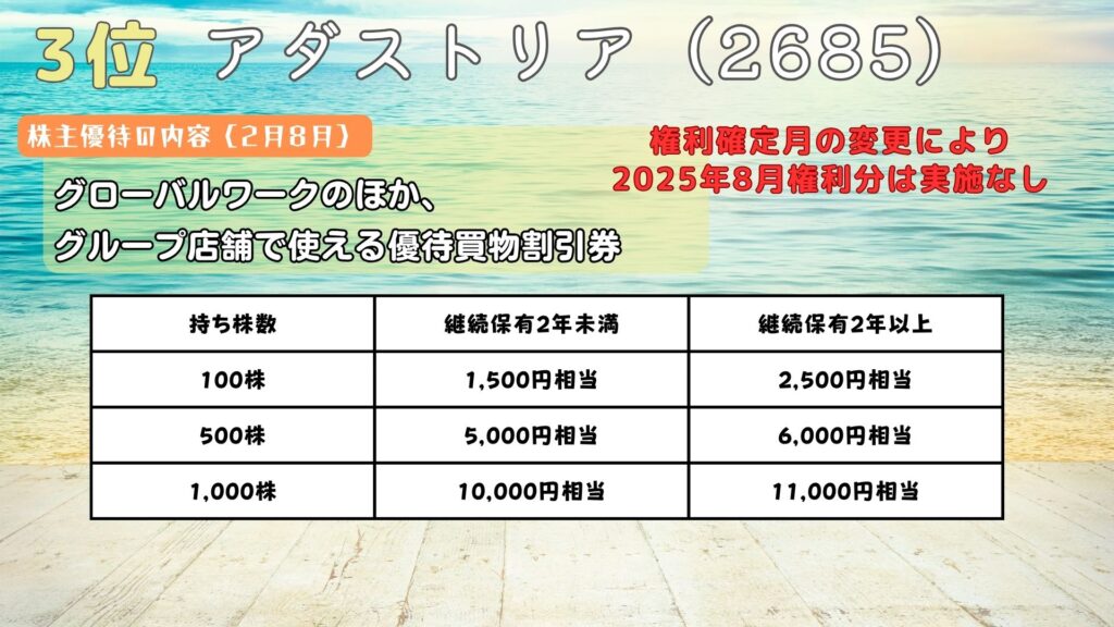 ただし、権利確定月の変更により、次回2025年8月権利分は実施がないので注意してね