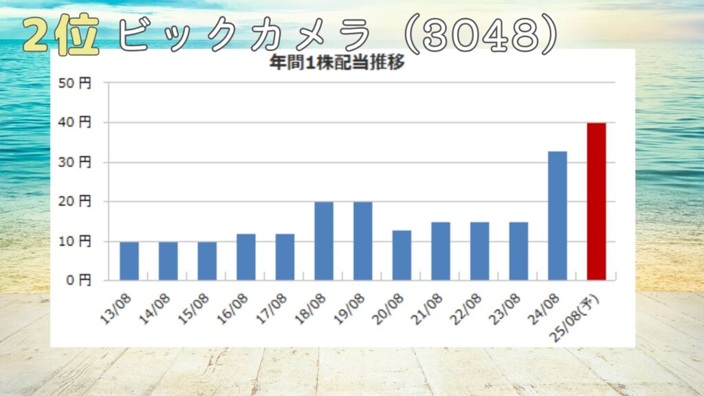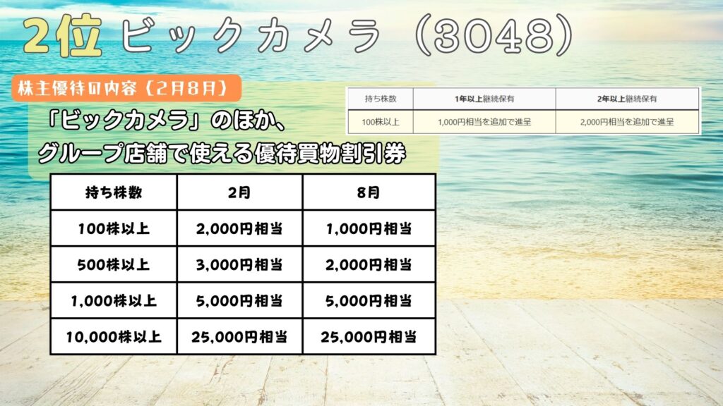 株主優待の内容は8月2月のねん2回、ビックカメラのほか、グループ店舗で使える優待買物割引券が貰えるよ。