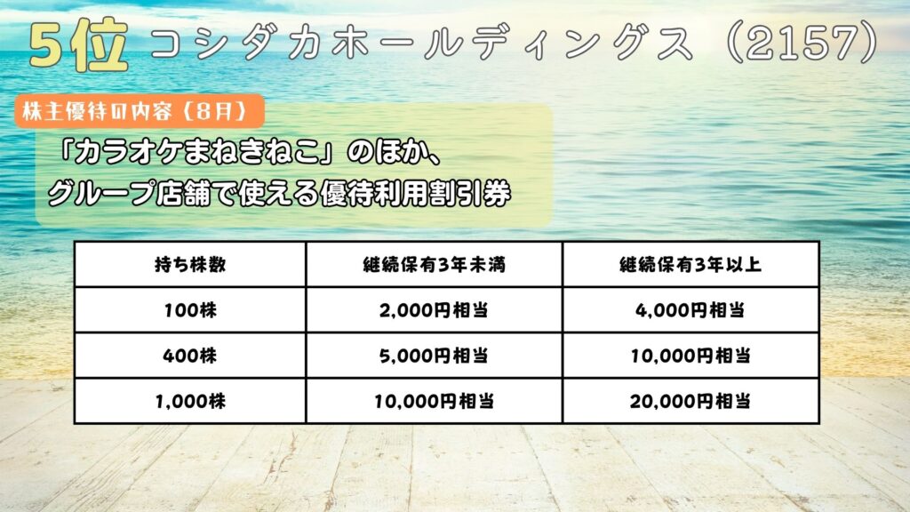 株主優待の内容は8月のねん1回、カラオケまねきねこのほか、グループ店舗で使える優待利用割引券が貰えるよ。