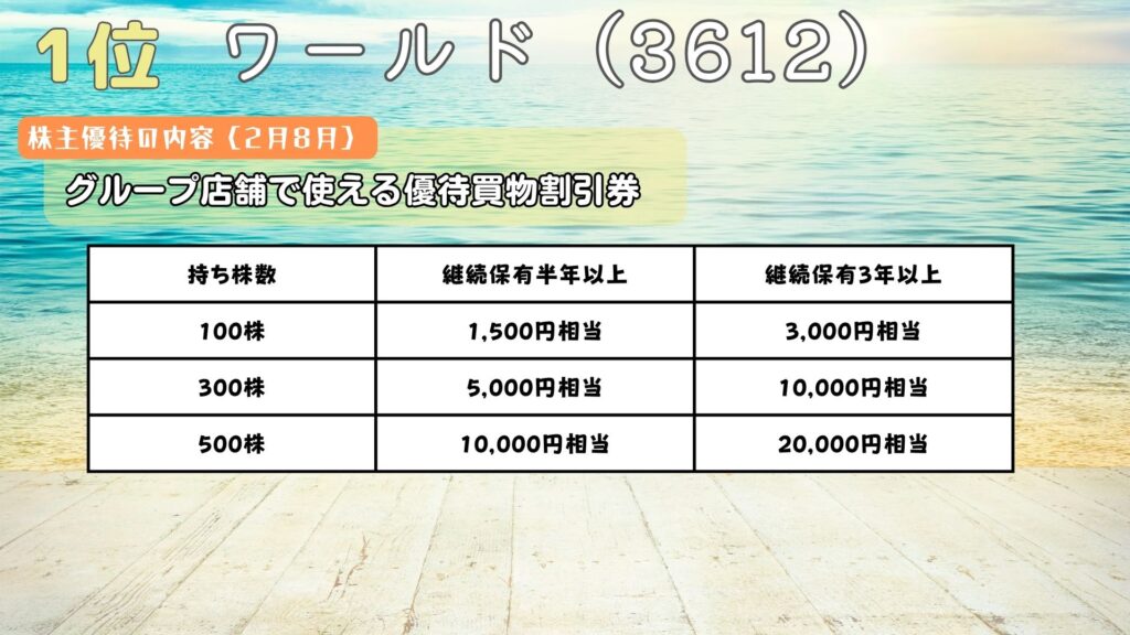 総合利回りが高く、長く持っているとお得な優待だね。
