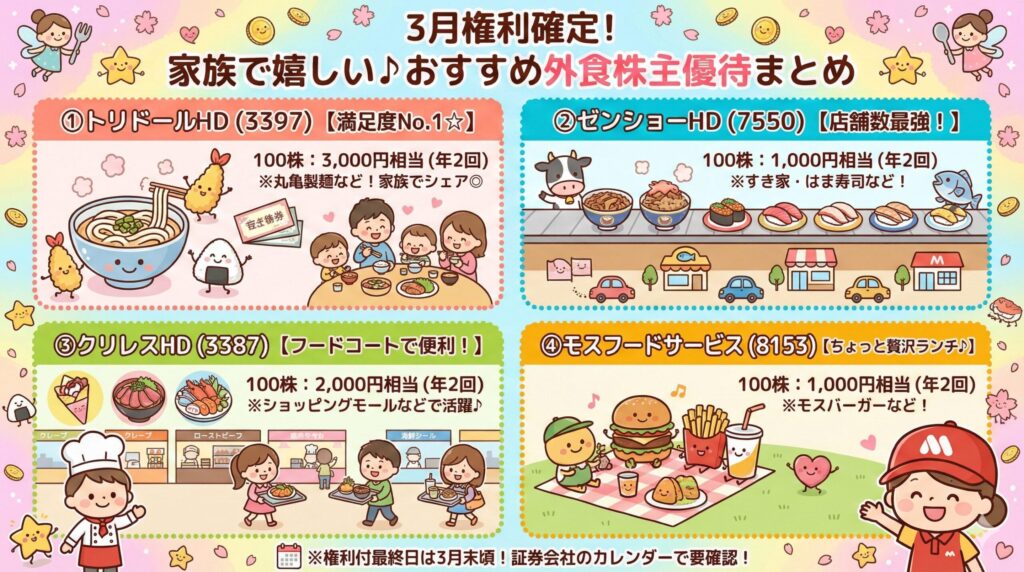 そんな子育て世帯の強い味方が、3月に権利確定を迎える**「外食チェーンの株主優待」です! 今回は、「店舗が多くて使いやすい」「子供が喜ぶ」「家計が大助かり」**な、3月の鉄板・飲食銘柄を厳選してご紹介します。