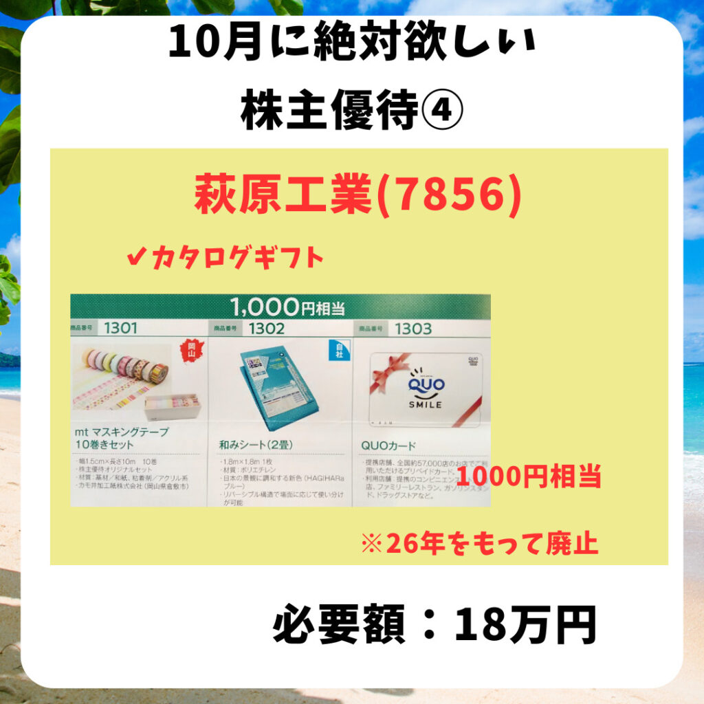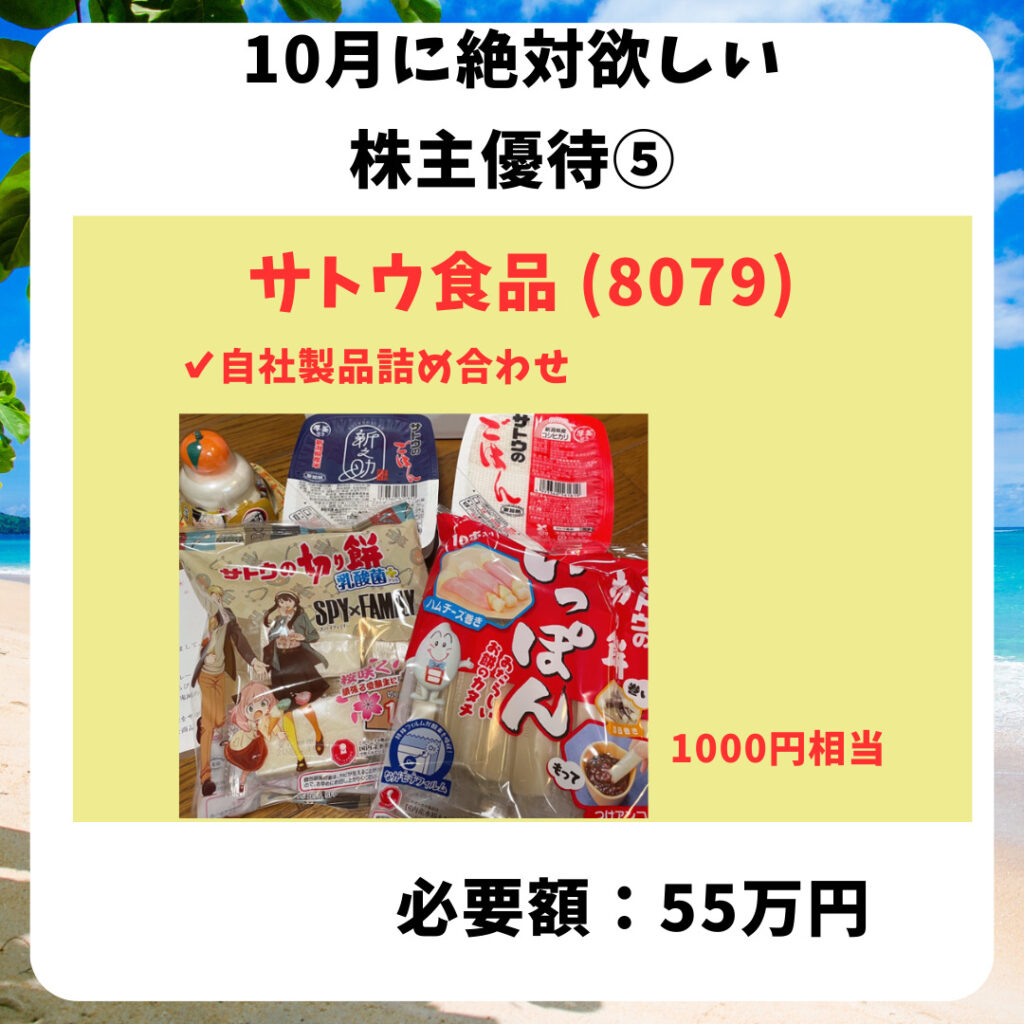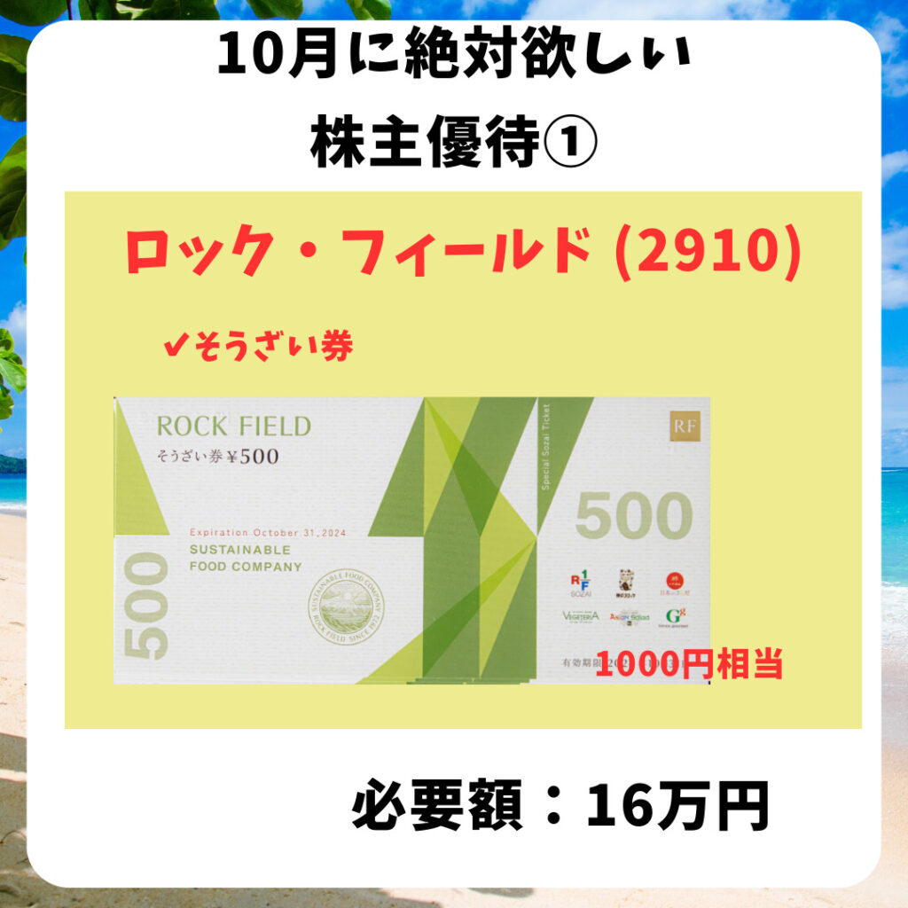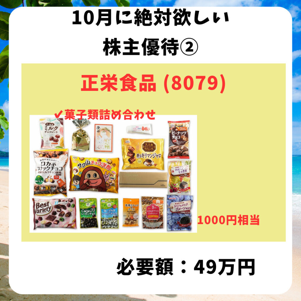 HOME > 株主優待 > 優待10月 > 優待10月 株主優待10月株主優待おすすめ 2023年9月28日 当ページのリンクには広告が含まれています10月の株主優待は少なめ😆そんな中でもおすすめの株主優待を紹介✨Contents1 ロック・フィールド2 正栄食品3 HIS4 萩原工業5 サトウ食品ロック・フィールドおそうざい券ちょっと高級な美味しいお惣菜、たまには食べたいね😋🍴💕正栄食品お菓子詰め合わせ子どもが喜ぶ株主優待🙌HIS旅行券大切な人とお得に旅行を🏨萩原工業カタログギフト。選べる楽しさあるね😆サトウ食品自社製品詰め合わせ保存が効くご飯はありがたい🍚権利付最終日は10/27(金)です✨ Twitter Share Pocket Hatena LINE URLコピー -優待10月, 株主優待