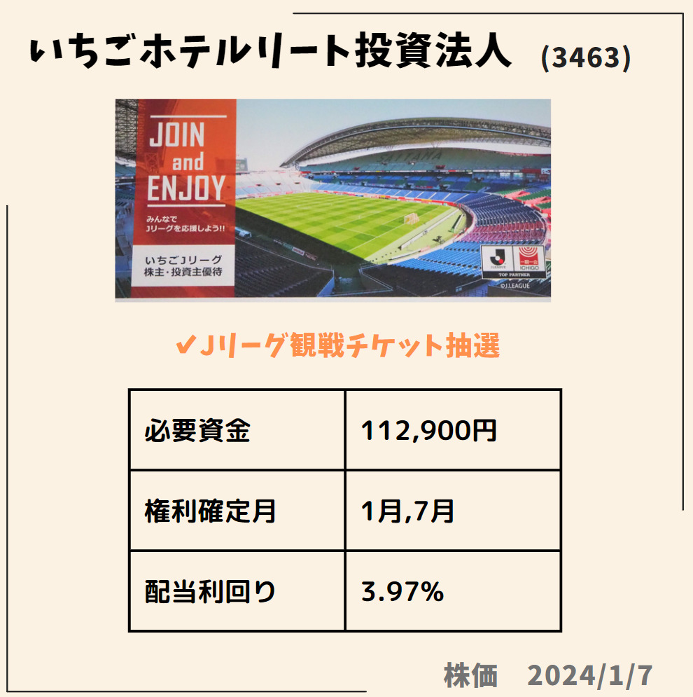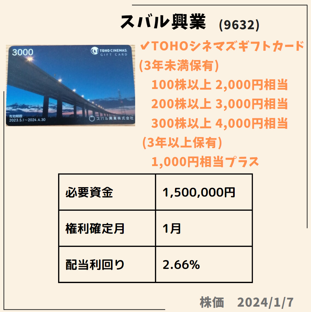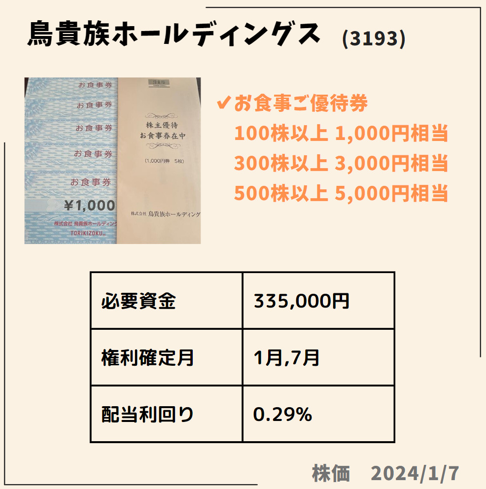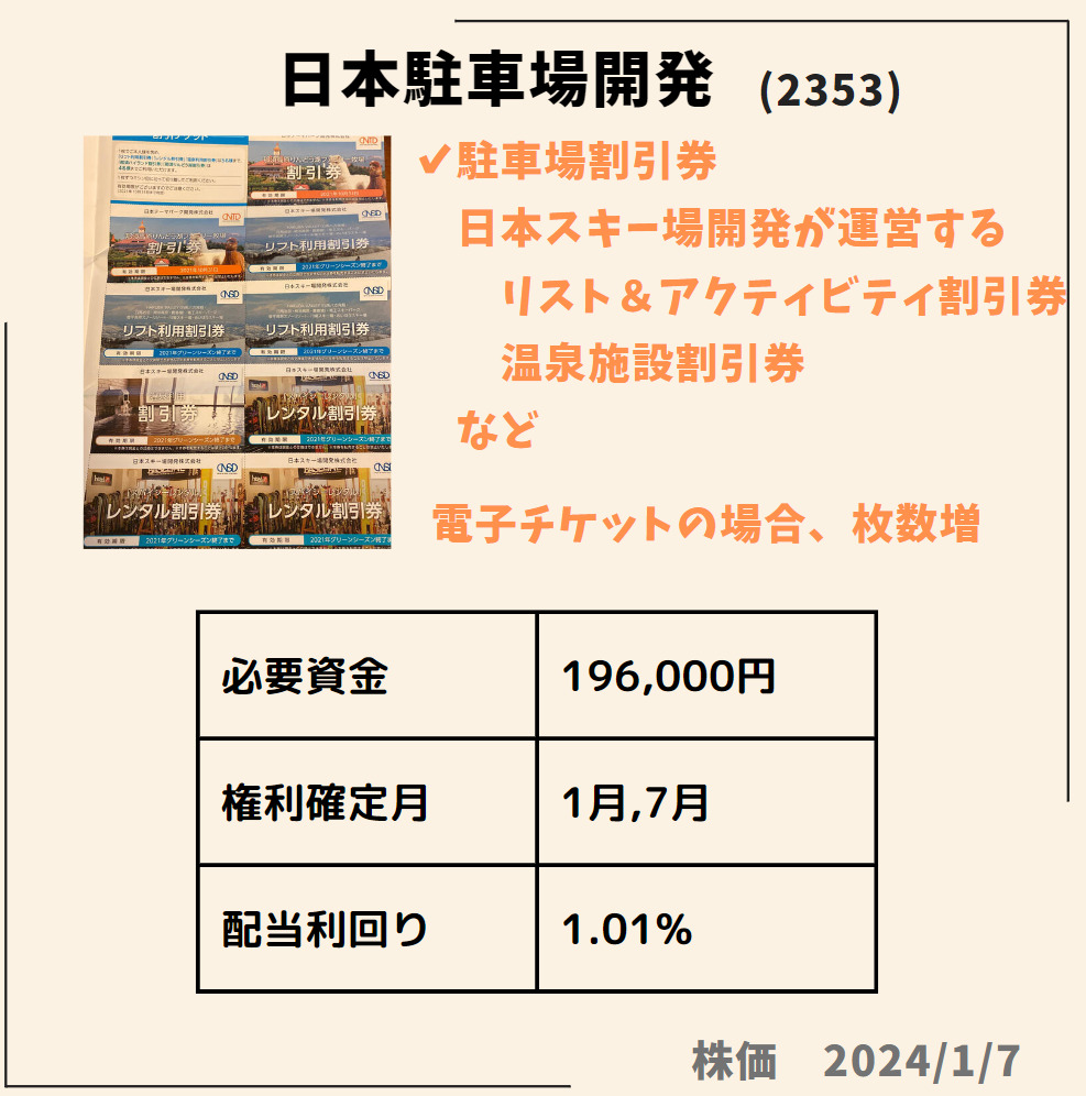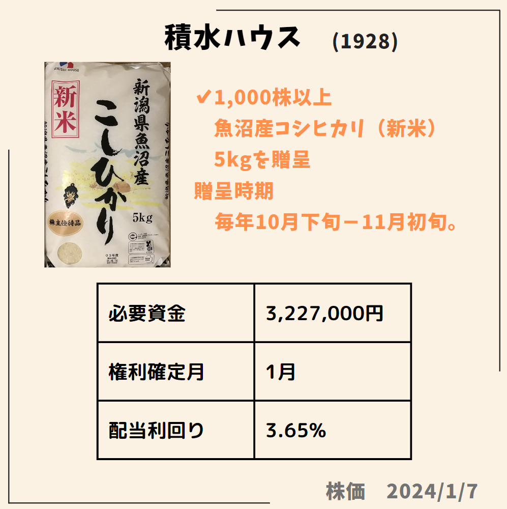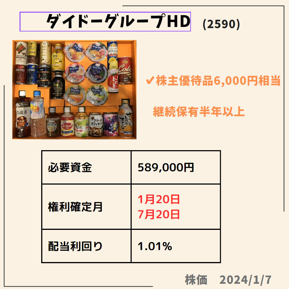 HOME > 株主優待 > 株主優待1月株主優待おすすめ 2024年1月11日 当ページのリンクには広告が含まれています1月に絶対欲しい株主優待✨🎁✨権利付最終日は2024年1/29(月)Contents1 ダイドーグループホールディングス(2590)2 日本駐車場開発(2353)3 TOKYO BASE(3415)4 鳥貴族ホールディングス(3193)5 スバル興業(9632)6 いちごホテルリート投資法人(3463)7 積水ハウス(1928)ダイドーグループホールディングス(2590)日本駐車場開発(2353)TOKYO BASE(3415)鳥貴族ホールディングス(3193)スバル興業(9632)いちごホテルリート投資法人(3463)積水ハウス(1928) Twitter Share Pocket Hatena LINE URLコピー -株主優待