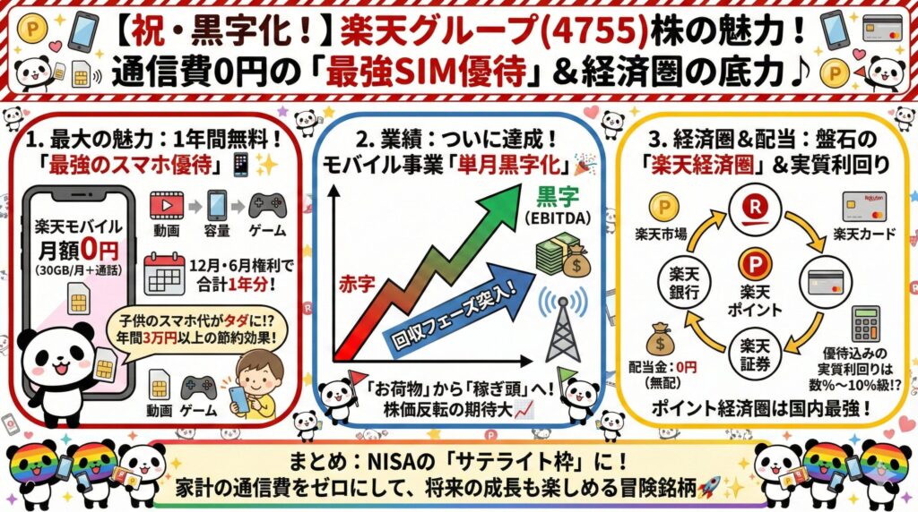「楽天モバイルの赤字で株価が…」なんて言われていたのは過去の話。 2026年2月の決算発表で、ついにモバイル事業が**利益を出せる体質(EBITDA黒字)**になったことが証明されました。 株価が底打ち反転しそうな今こそ、家計を助ける「実益重視」の投資チャンスです。