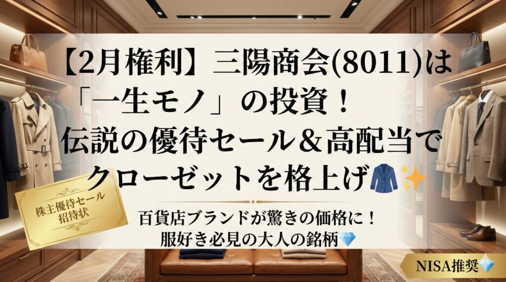 若い頃は流行りの服を毎年買い替えていたけれど、最近は「良いものを長く着たい」と思うようになった。そんなことはありませんか? もしそうなら、三陽商会の株を持つのが正解です。 「MACKINTOSH LONDON」や「Paul Stuart」など、デパートに並ぶ高級ブランドが、株主だけ驚きの価格で買える秘密のイベントにご招待。 2月末に権利を迎える、この「大人の優越感」たっぷりの銘柄をご紹介します。