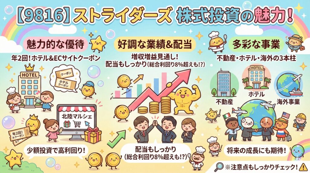 いかがでしたでしょうか?ストライダーズ(9816)は、少額から投資を始めたい方や、ホテル宿泊・お取り寄せがお好きな方にとって、非常に面白みのある銘柄です。リスクをしっかり理解した上で、ポートフォリオの一部に検討してみてはいかがでしょうか。