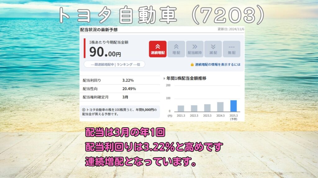 また、トヨタは堅実な配当政策を持っており、長期投資家にとって魅力的な銘柄です。配当利回りは自動車業界の中でも比較的高く、安定したキャッシュフローが確保されているため、株主還元も期待できます。